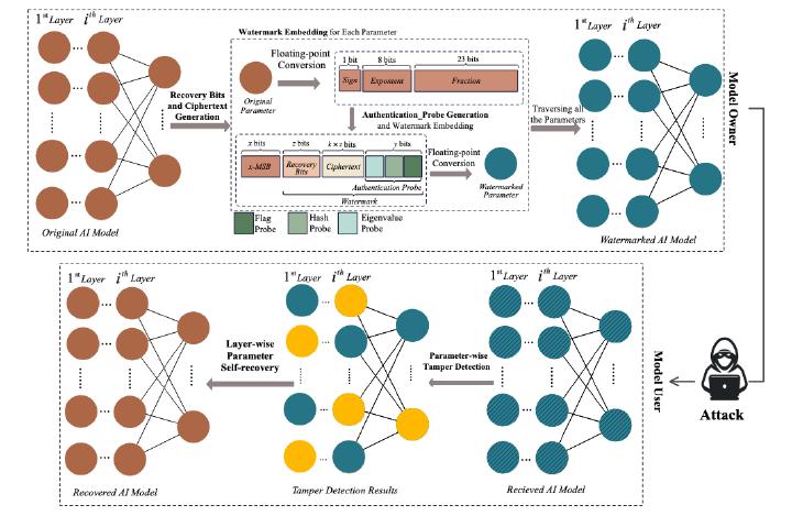 Artificial Intelligence (AI) models are valuable and frequently face malicious tampering attacks, which require significant data and time to retrain when compromised. To address this issue, we propose a Guarded Highfidelity Compression-based Watermarking (GHCW) scheme for detecting and further recovering the tampered parameters, aiming to protect the model’s functional performance without the necessity for retraining. In GHCW, the watermark consists of an authentication probe for tamper detection, recovery bits, and ciphertext for model recovery. The authentication probe is generated by computing inherent characteristics of the parameters using hash algorithms and eigenvalue calculations. Different from existing works, the recovery bits are produced through a high-fidelity model compression technique, which concentrates key model information into fewer high-priority bits. This design enables the recovery mechanism to remain effective even under largescale parameter tampering. To protect these bits, they are linearly encrypted with a key, generating a ciphertext that serves as a guard. To the best of our knowledge, we are one of the first to propose and implement this idea in the area of AI model protection. Experimental results demonstrate that GHCW excels in recovering models from tampering, especially large-scale parameter disturbance. Compared to existing methods, GHCW shows superiority in both model recovery and tolerance to tampering rate, tolerating tampering rates up to 70%, while existing methods recover at most 50%.