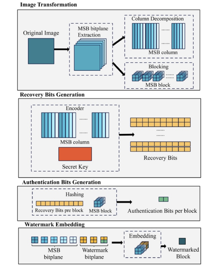 To protect the integrity and reliability of images, we propose a watermarking-based approach for identifying whether the image has been tampered with during transmission and recovering the tampered content to its original form. The tampered pixel values are treated as unknowns in our proposed method and are calculated by solving a system of equations using Gauss-Jordan elimination. The recovery data is obtained by encoding the MSB matrix with a secret key and then embedded as part of the watermark for content self-recovery. The remainder of the watermark is authentication information for localizing the forged region, which is produced by MSB and recovery information of each block. Compared with existing works, the experimental results with our method show superior recovery capability.